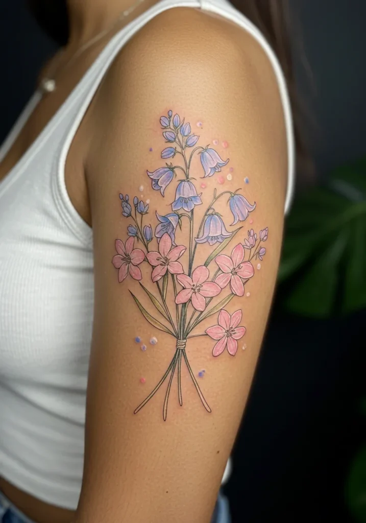 This whimsical fine line bouquet tattoo brings together soft bluebells and sweet pink star-shaped flowers in a perfectly balanced bunch. The stems are tied together at the base with a simple line wrap, creating a charming handpicked vibe. Each petal is shaded in delicate pastel tones with fine outlines that make the entire design feel airy and light. The scattered dots in lavender and blush give it a soft, dreamy aura that makes the upper arm placement feel like a living watercolor.