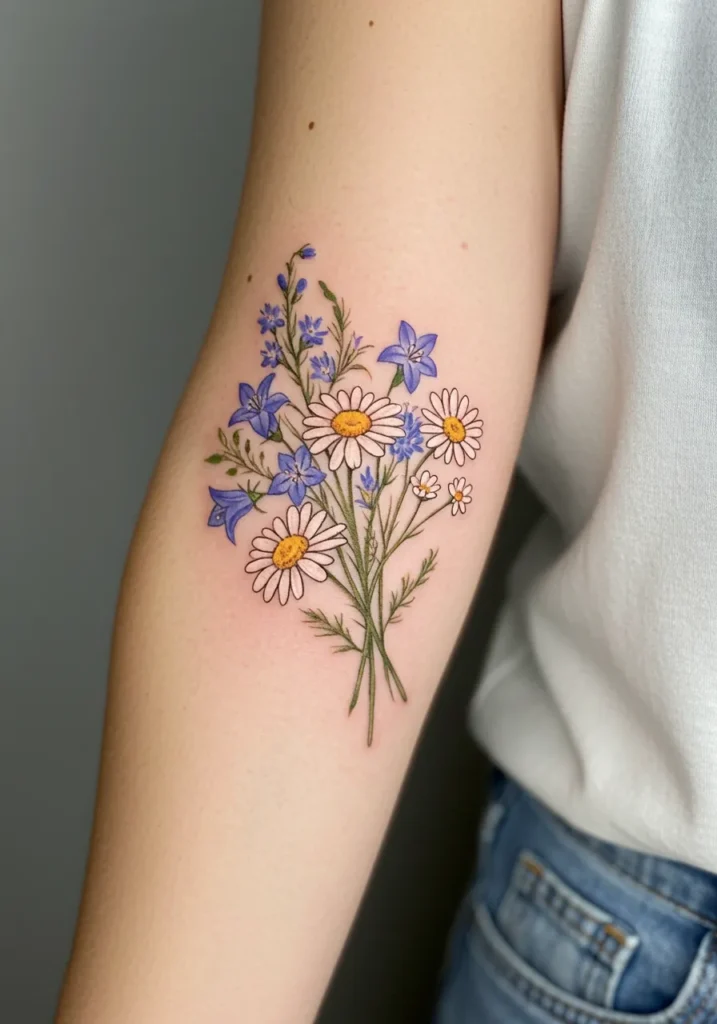 This fresh and airy fine line bouquet tattoo blends classic white daisies with a scattering of delicate bluebells and tiny wildflowers. The fine stems cross naturally at the base, giving the whole design a soft, picked-from-a-meadow feel. The colors are gentle but vibrant, with golden daisy centers and touches of lavender and indigo throughout. Sitting beautifully on the outer arm, the placement adds a sweet, summery charm that feels both timeless and modern.
