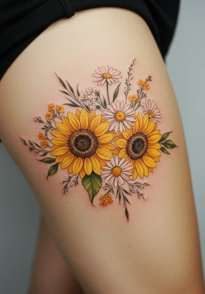 I m seriously obsessed with how happy this one feels. It s like sunshine in tattoo form. The contrast between the bold sunflowers and the dainty daisies is just perfect, and the thigh placement adds a playful but confident vibe. I d honestly get this just for the mood boost alone. It s the kind of tattoo that makes you feel bright and beautiful every time you see it.