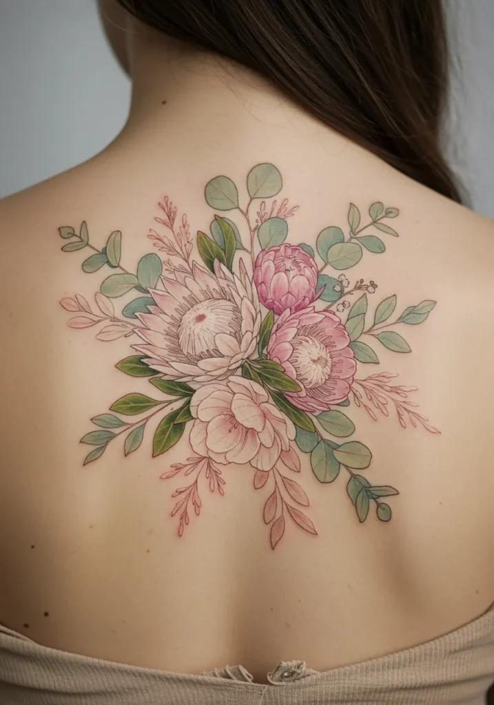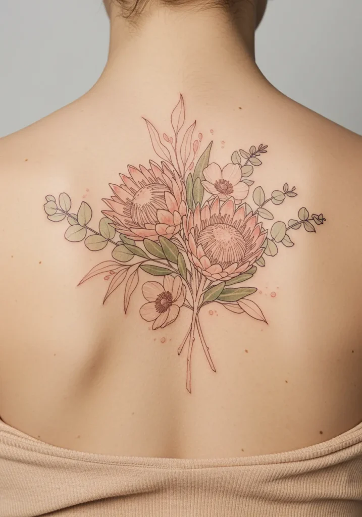 This soft and graceful fine line bouquet tattoo centers around two large king protea blossoms, framed with delicate wildflowers and eucalyptus leaves. The muted pinks and greens give it a watercolor-like softness, and the gentle linework keeps the whole design feeling airy and romantic. It flows naturally across the upper back, with just the right amount of floral fullness without looking crowded or stiff.