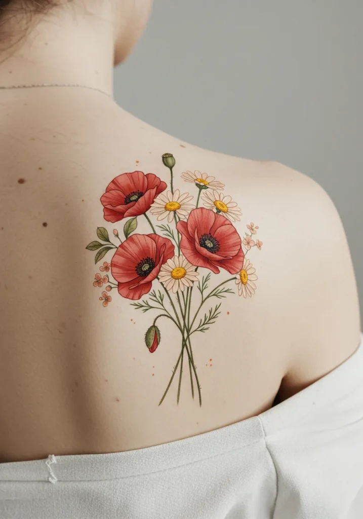 I think this one is just the perfect mix of sweet and statement. The poppies make it feel strong and passionate, while the daisies keep things light and carefree. I love how it rests right on the shoulder too. It s the kind of placement that feels effortlessly pretty, like you just happen to bloom naturally. Honestly, it makes me want to wear something off-shoulder just to show it off.