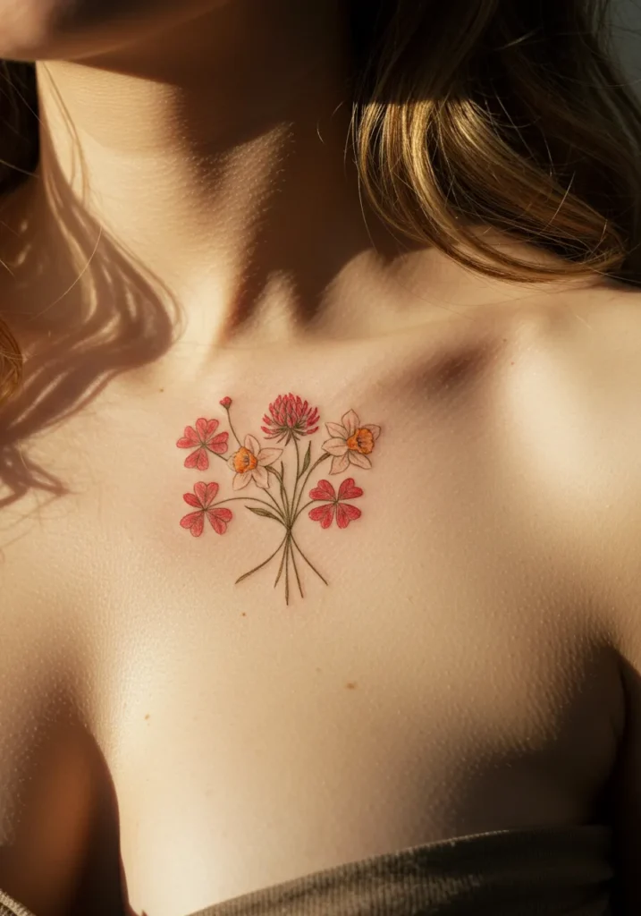 This sweet fine line bouquet tattoo brings together cheerful red clovers, soft pink wildflowers, and two petite daffodils in the most delicate way. Each flower is drawn with whisper-thin outlines, giving the whole bouquet a fresh and airy feel. The placement right beneath the collarbone adds a soft, centered glow to the chest without overwhelming the space. The blend of coral and peachy hues against subtle green stems creates that perfect springtime vibe.
