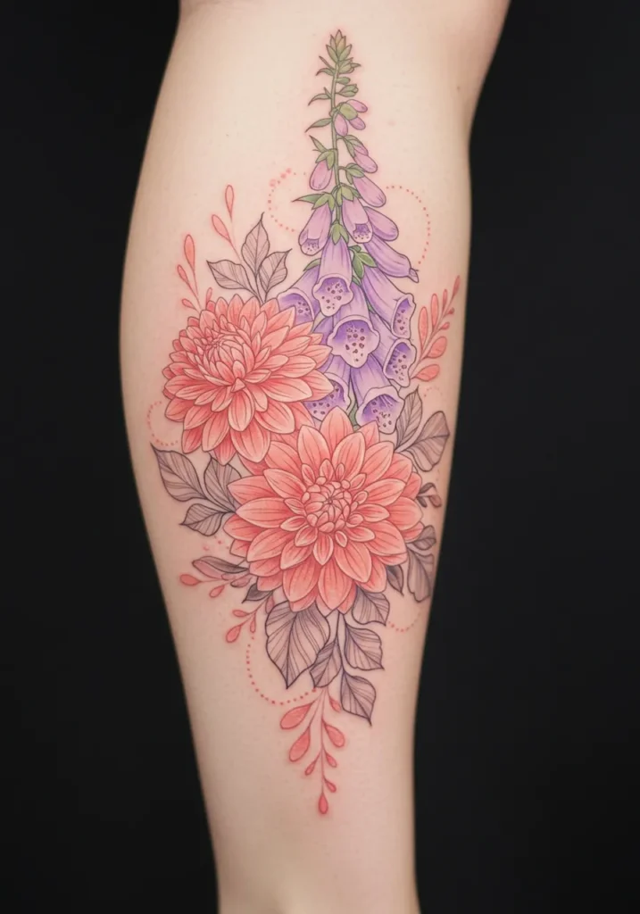 This fine line bouquet tattoo blends soft coral dahlias with a tall stem of purple foxglove, creating a stunning vertical design on the calf. The petals are layered in dreamy detail, with each one shaded in warm coral tones that practically glow against the skin. The foxglove rises gracefully behind them, with delicate purples and a touch of soft green bringing contrast and depth. Flowing leaves and dotted accents complete the look with just the right balance of elegance and whimsy.