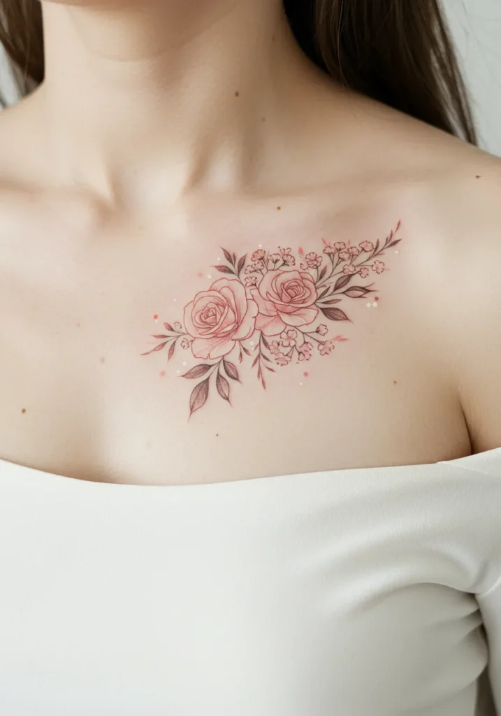 This delicate fine line bouquet tattoo features two soft pink roses surrounded by sprigs of baby s breath and wispy leaves, all shaded in gentle tones of blush and brown. It sits just below the collarbone, curving gracefully with the body and adding a subtle elegance that s both timeless and romantic. The fine lines give it a lacy, almost translucent quality, and the soft color wash makes it feel like it s been gently painted on.
