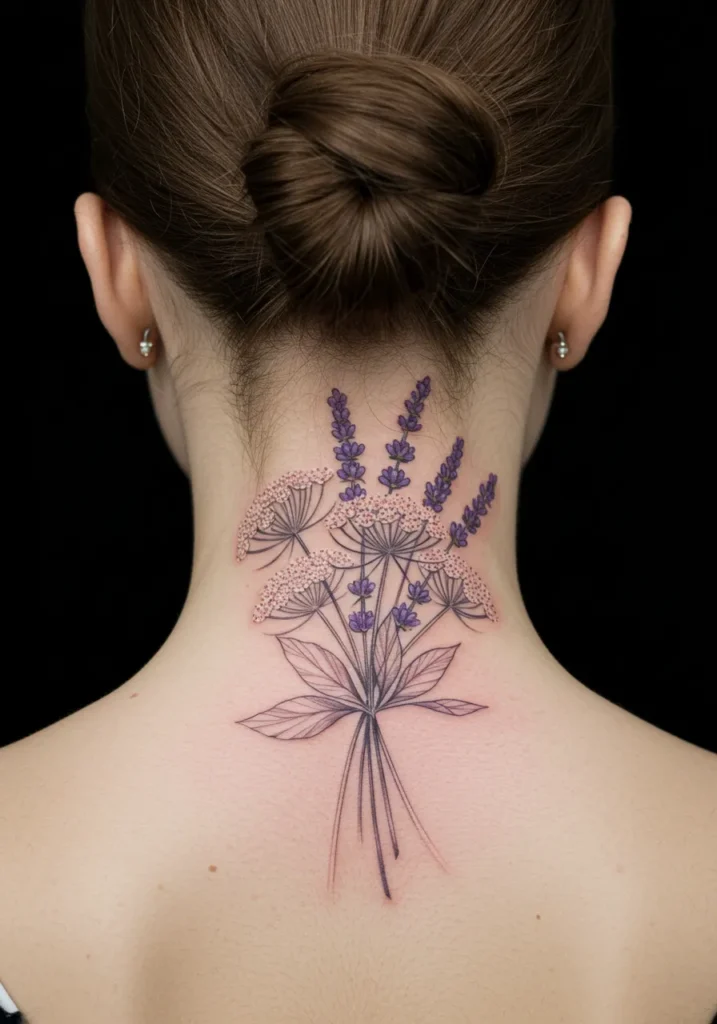 This stunning fine line bouquet tattoo combines soft lilac lavender stems with delicate clusters of Queen Anne s lace, placed beautifully at the nape of the neck. The design fans upward like a floral crown, hugging the neckline and creating a gentle frame just beneath the hairline. The color palette is soft and romantic, with pale purples and muted pinks outlined in graceful black lines. Each tiny flower is so intricate, it looks like it could ve been drawn with a botanical pen.