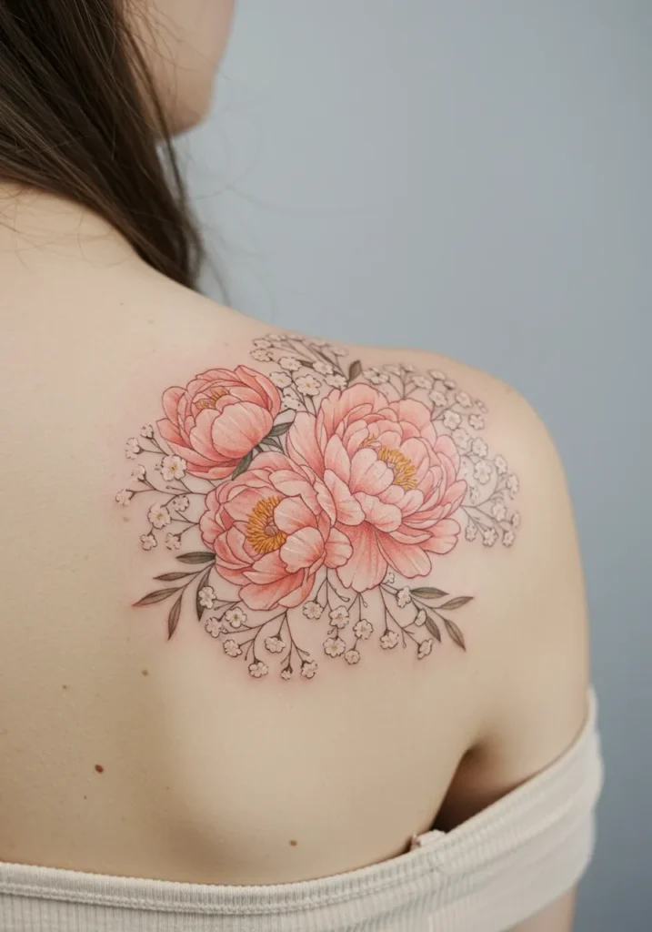 This bouquet tattoo blends soft elegance with bold placement. Three lush coral-toned peonies sit at the heart of the design, their layered petals glowing with delicate shading. Surrounding them is a halo of baby s breath, drawn with fine, whisper-thin lines that give the whole piece a graceful, airy finish. The bouquet flows naturally along the curve of the shoulder, making it feel like it bloomed right there.