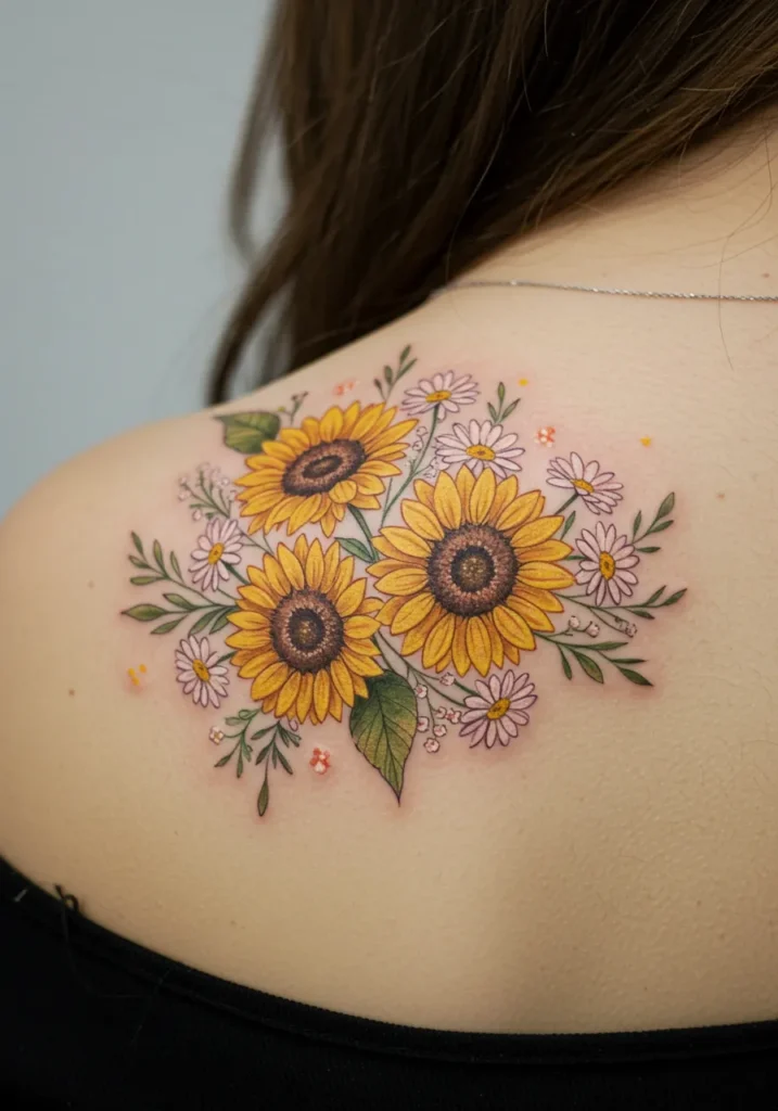 This joyful bouquet tattoo bursts with bright yellow sunflowers surrounded by soft pink and white daisies. The fine line detailing makes the floral shapes feel delicate, while the bold colors bring all the happy summer vibes. The placement on the upper shoulder perfectly follows the curve of the back, almost like nature s version of a shoulder pad. Every petal is shaded with care, giving the piece a fresh, almost botanical-illustration feel.