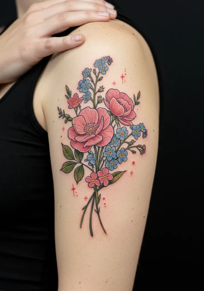This bold and playful fine line bouquet tattoo features soft pink wild roses surrounded by clusters of bright blue forget-me-nots. The flowers are layered with care, giving the design a full, fresh-picked feel. Fine black outlines keep everything crisp, while small red sparkle accents sprinkled around the bouquet add a little bit of magic and fun. It s placed perfectly on the upper arm, giving it that eye-catching look without feeling too heavy.