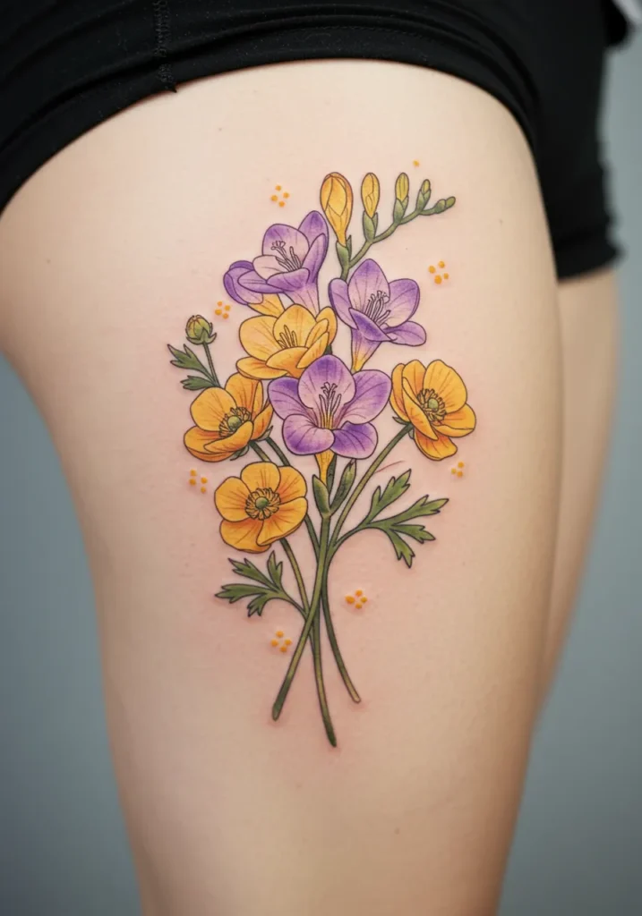 This eye-catching fine line bouquet tattoo brings together cheerful golden buttercups and soft lavender-hued freesia, blooming in perfect harmony. The flowers are arranged in a natural flow, with delicate stems and foliage drawing the eye upward along the thigh. The colors are bright without being overwhelming, and the fine black outlines keep everything feeling light and graceful. Tiny orange dots scattered throughout add the sweetest finishing touch.