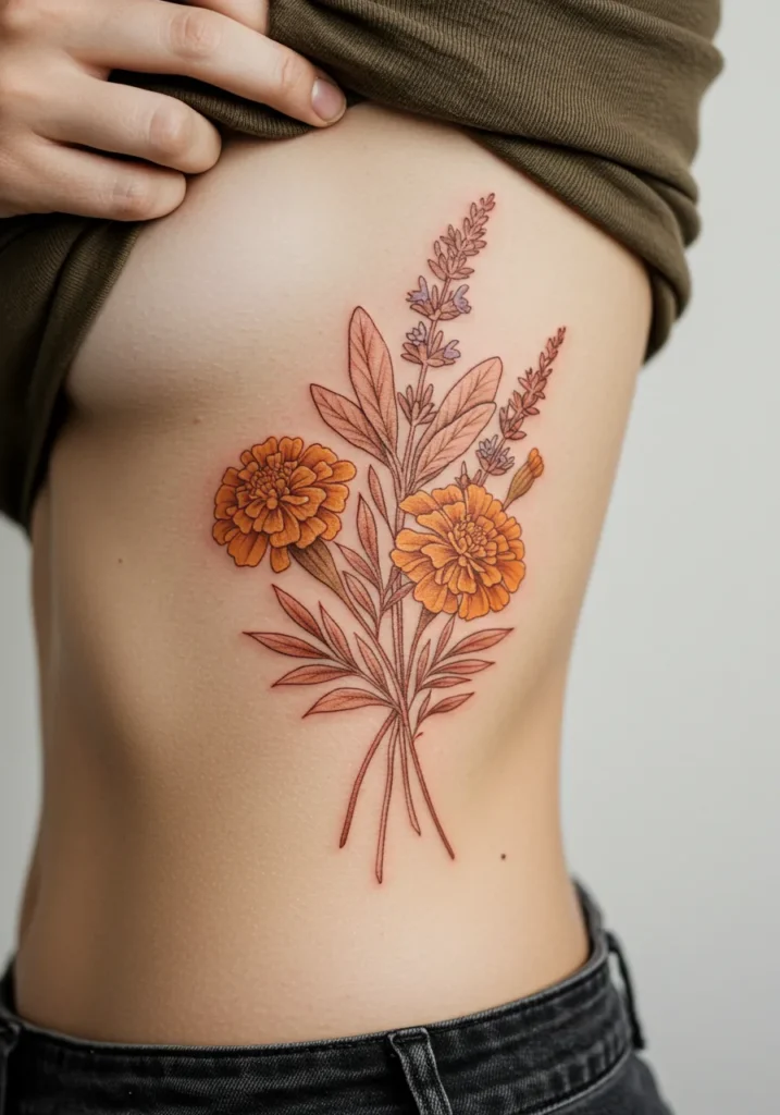 This fine line bouquet tattoo blends warm orange marigolds with soft sprigs of lavender in a beautifully structured rib placement. The flowers stretch upward along the side, with delicate stems and muted green leaves that balance the bright bloom tones. The marigolds have rich golden petals that pop against the skin, while the lavender adds a cool contrast with its pale purple accents. Every line feels intentional, and the color shading is soft and seamless.