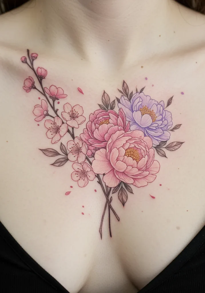 This dreamy collarbone tattoo features a graceful mix of soft pink cherry blossoms and voluminous peonies in full bloom. The composition is delicate yet rich, with each petal and branch drawn in elegant fine line detail. A single lavender peony peeks out from behind the soft pinks, adding the perfect pop of color contrast. The blossoms curve beautifully along the natural line of the collarbone, creating a flattering shape that hugs the chest with gentle femininity.