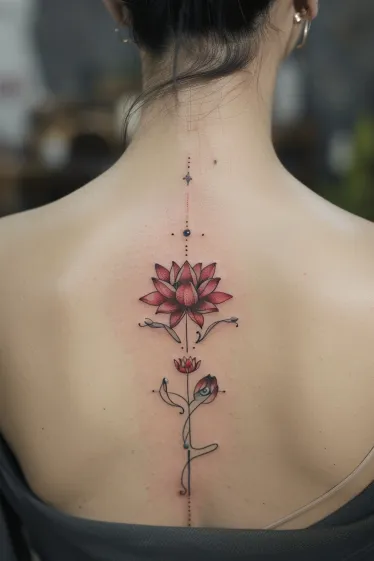 This delicate fine line tattoo runs gracefully down the spine, featuring a blooming lotus at the top with smaller buds unfolding below. The petals are shaded in soft reds and pinks with just the right amount of contrast, while the thin stem stretches downward, winding between tiny geometric accents and dots. The composition feels so centered and symmetrical, almost like it s aligning with your energy or following the rhythm of your breath.