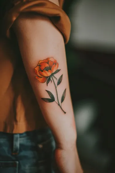 This beautiful forearm tattoo showcases a single blooming peony, brought to life with soft fine lines and rich orange hues that make it glow against the skin. The petals are gently layered with a subtle gradient, while the green leaves offer contrast and depth without overpowering the flower. It s simple but so full of presence, with a slender stem that follows the natural curve of the arm. The overall look is clean, elegant, and timeless in the best way.