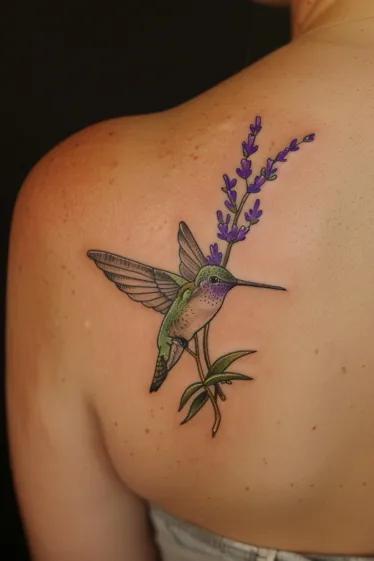 This elegant tattoo features a finely detailed hummingbird mid-hover, gently sipping from a tall lavender stem. The linework is crisp and soft, giving the design a lightweight and graceful feel. The hummingbird is shaded in beautiful tones of green and lilac, with wings that look like they could flutter right off the skin. The lavender is drawn with delicate precision, each tiny purple bloom adding a calming, natural charm. It sits perfectly on the upper back near the shoulder blade, like a little moment of peace frozen in time.