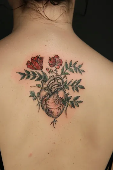 This striking tattoo features a beautifully detailed anatomical heart at the center, growing into a blooming bouquet of red roses and leafy vines. The fine line work gives everything a soft, hand-drawn feel, while the shading adds just the right amount of depth without making it feel heavy. The heart is realistic but not too intense, with a gentle pink hue and vines wrapping naturally around its edges. The roses on top are full of life, bursting in rich red tones that stand out perfectly on the upper back.