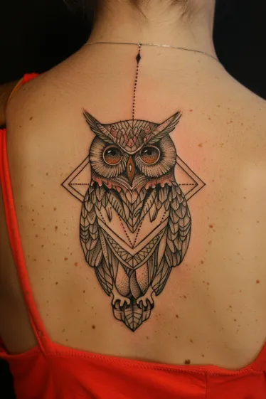This bold yet intricate back tattoo features a stylized owl drawn entirely in fine lines and sharp geometric patterns. The feathers are layered in textured shapes, each with its own unique linework that adds depth without crowding the design. The owl s wide eyes are the star of the show, perfectly symmetrical and full of personality. Set against a diamond outline and connected to a vertical dotted line that runs up the spine, the whole composition feels powerful and intentional.