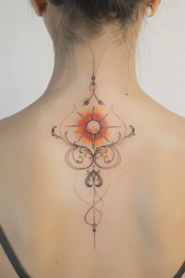 This gorgeous upper back tattoo features an ornate sun design at the center, bursting with a soft watercolor blend of fiery orange and red that glows like a little ember on the skin. The sun is perfectly balanced by delicate fine line swirls, curves, and filigree elements that extend both above and below, forming a symmetrical vertical pattern that hugs the spine beautifully. The entire piece feels like a mix between celestial energy and vintage ironwork, creating a look that s both feminine and powerful.