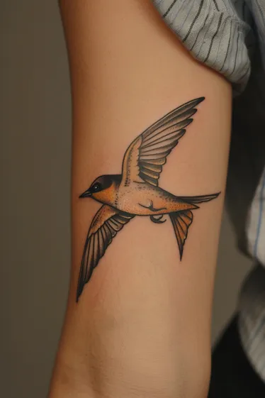 This lovely arm tattoo features a swallow in mid-flight, captured with clean fine lines and soft shading that brings the feathers to life. The bird s wings are stretched wide, giving it that light and breezy look, and the muted tones of tan, black, and soft orange make the whole design feel warm and natural. It s simple in the best way, with just enough detail to keep it interesting without feeling heavy. The placement fits perfectly on the inner arm, like a quiet little moment of freedom.