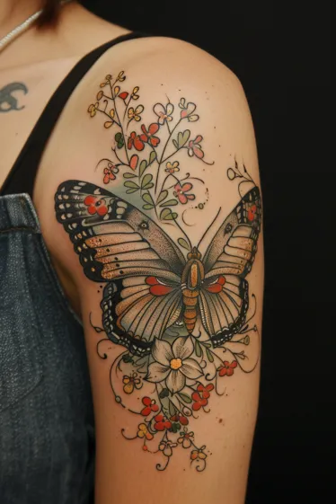 This dreamy upper arm tattoo features a beautifully detailed butterfly spreading its wings among a burst of delicate wildflowers. The butterfly itself is shaded in soft neutrals with warm hints of red and cream, outlined in crisp fine lines that keep everything feeling light and graceful. The floral elements weave around the wings and trail upward in a loose, whimsical way, with tiny yellow blossoms, red berries, and soft greenery giving it a fairytale garden vibe. Everything is perfectly placed to hug the arm and move with the shape of the body.