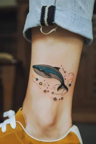 This playful ankle tattoo features a sleek fine line whale swirling through a dreamy trail of colorful stars and dotted motion lines. The whale is shaded in deep blue tones with soft highlights that give it a magical glow, while the yellow, orange, and pink stars pop with cheerful charm. Everything is perfectly balanced in size and detail, creating a fun and lighthearted piece that still feels artistic and refined.