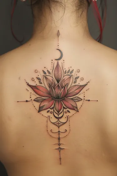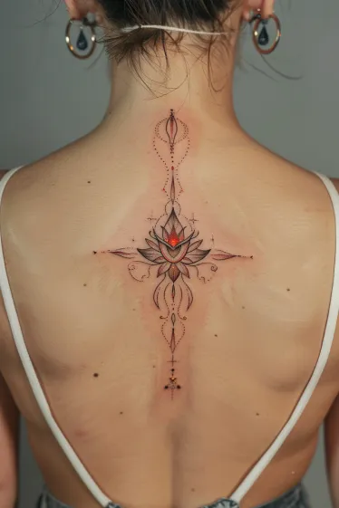 This stunning tattoo sits perfectly along the upper spine and radiates balance and elegance. At its heart is a beautifully detailed lotus flower shaded in warm pinks and deep reds, with soft black and brown lines creating that delicate petal layering. Above the flower, a tiny crescent moon adds a mystical touch, while the fine line geometric patterns stretch vertically in both directions, giving the whole piece a structured, harmonious feel. The dotted detailing and ornamental elements make the whole tattoo feel almost like jewelry for your back.