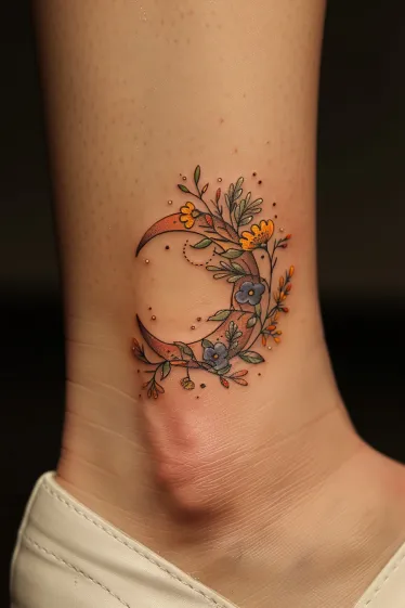 This tattoo is a gorgeous example of how fine line work can feel both delicate and lively. A soft crescent moon is carefully wrapped in a cluster of dainty flowers and leaves, all shaded in lovely earth tones and muted colors like mustard yellow, deep green, and soft violet. The floral elements follow the curve of the moon in such a graceful way, giving it that magical garden vibe. It s placed right above the ankle, making it easy to show off in sandals or heels but also subtle enough to keep personal if that s your thing.