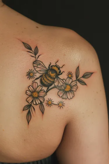 This lovely shoulder tattoo features a detailed fine line bee in flight, surrounded by soft, blooming daisies and leafy stems. The linework is crisp and delicate, giving the whole piece a light and airy feeling even though it s packed with detail. The bee is colored in warm shades of gold and brown, while the flowers have soft yellow centers and white petals with just a hint of blush. Everything comes together in a way that feels balanced and natural, like a tiny moment of springtime frozen in ink.