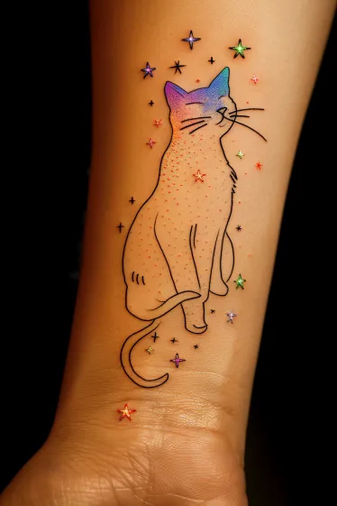 This tattoo is pure cosmic cuteness. It features a fine line cat sitting gracefully, outlined in soft black ink with delicate dotted shading that gives it texture without making it feel heavy. The cat s ears and forehead are kissed with a subtle ombré blend of purple and blue, almost like it s soaking in stardust. Surrounding the cat are tiny colorful stars in every shade of pastel and neon, scattered like a dreamy little galaxy across the forearm. It s playful, feminine, and just a little bit magical.