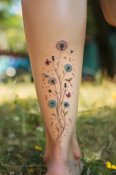 This whimsical tattoo climbs beautifully up the back of the leg, featuring tall, delicate wildflowers drawn in soft fine lines with gentle curves that feel completely natural. The flowers bloom in shades of pastel blue and purple, with wispy dandelion tufts drifting away like little pieces of magic. Scattered throughout are tiny butterflies and fluttering petals, all in vibrant colors that make the design feel so full of life. The whole composition flows upward like a garden caught in a breeze, creating a light and airy look that s just enchanting.