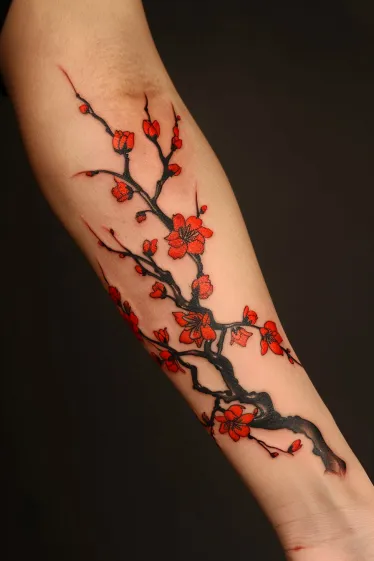 This stunning fine line forearm tattoo wraps beautifully around the arm with a bold black branch that contrasts against vibrant cherry red blossoms. The petals look like they re mid-bloom, almost dancing across the skin. Even though the branch itself is thick and strong, the flowers are detailed with soft fine lines that give the whole piece a feminine, artistic balance. It feels wild and elegant all at once, like nature doing its thing in the most graceful way possible.