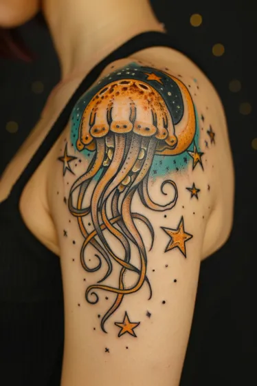 This dreamy shoulder tattoo brings together a glowing jellyfish and a celestial sky, all tied together with delicate fine lines and vibrant color. The jellyfish floats gently across the shoulder, its tentacles flowing downward in graceful curves. Rich oranges, teal blues, and soft blacks make the whole piece pop, especially against the crescent moon and scattered stars surrounding it. Every detail is clean and intentional, blending whimsy with elegance in the coolest way.