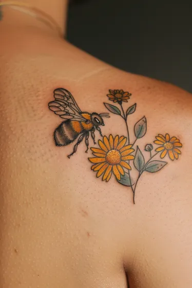 This sweet shoulder tattoo brings together the warmth of blooming marigolds and the charm of a hardworking little bee. The fine line outlines give it a soft, hand-drawn feel, while the yellow and orange hues in the flowers really pop against the skin. The bee s fuzzy body is shaded in natural tones, and its wings are translucent with the prettiest detail. Everything is perfectly spaced to keep it feeling light and airy, while still full of character and movement.