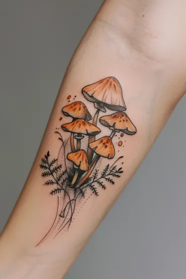 This whimsical forearm tattoo features a charming little cluster of orange mushrooms with a fine line touch and soft botanical elements underneath. The mushrooms are shaded in warm burnt orange with subtle texture on the caps, while delicate fern fronds and tiny black dot accents create an earthy, fairy-tale forest vibe. The design rises gracefully along the arm, making it feel like the mushrooms are quietly growing there naturally.