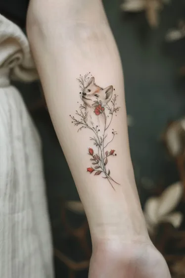 This charming forearm tattoo features a tiny fox peeking through a tangle of wildflowers, all drawn in delicate fine lines with soft splashes of earthy color. The fox has a peaceful little expression, almost as if it s taking a quiet moment in a forest meadow. The florals grow vertically with red buds and wispy leaves, creating a natural flow that flatters the shape of the arm beautifully. Every detail is so soft and graceful, making the whole design feel like a little secret story blooming on your skin.