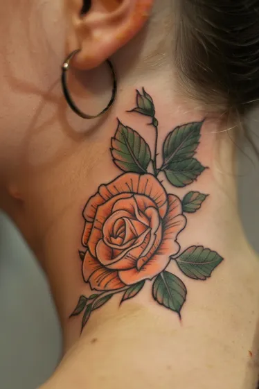 This gorgeous neck tattoo features a blooming rose crafted with delicate fine lines and soft shading. The petals glow with subtle orange tones, while the leaves stay crisp and natural in deep green. The black linework is clean and precise, giving the whole design a lightweight, airy feel despite its bold placement. It hugs the curve of the neck beautifully, sitting just beneath the ear and trailing slightly down the side.