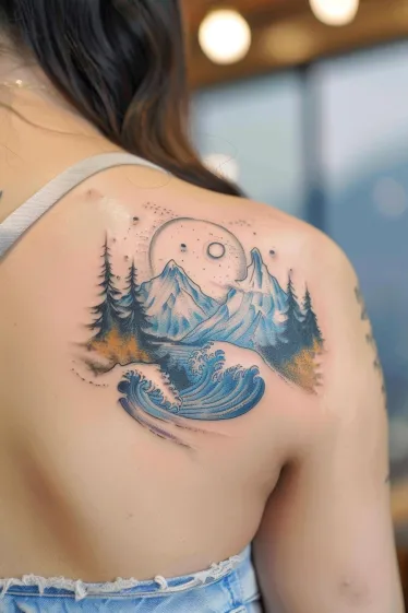 This stunning upper back tattoo paints a dreamy landscape with delicate fine lines and soft watercolor-style shading. Snowy mountains rise behind a moonlit sky, surrounded by tall pine trees and swirling ocean waves crashing in the foreground. The color palette is mostly cool blues and muted yellows, giving it a peaceful, twilight kind of glow. It s balanced and serene, with just enough detail to feel alive without overwhelming the senses.