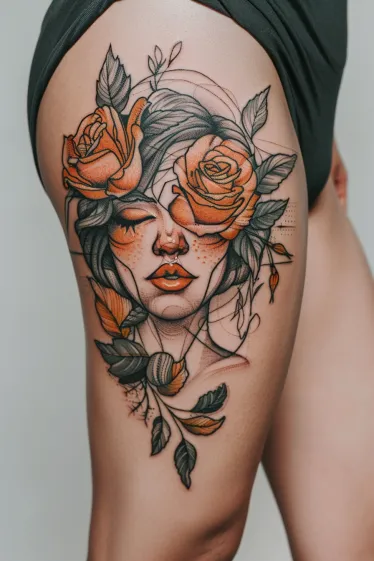 This breathtaking thigh tattoo features the dreamy portrait of a woman whose eyes are gently closed, with blooming orange roses and flowing leaves woven through her hair and around her face. The fine line work gives it that soft, sketch-like elegance, while the shading and color in the roses add bold contrast and warmth. Her lips are a muted terracotta, her expression calm and ethereal, and the overall composition feels like a blend of art nouveau and fairytale magic. It s large, confident, and full of emotional depth.