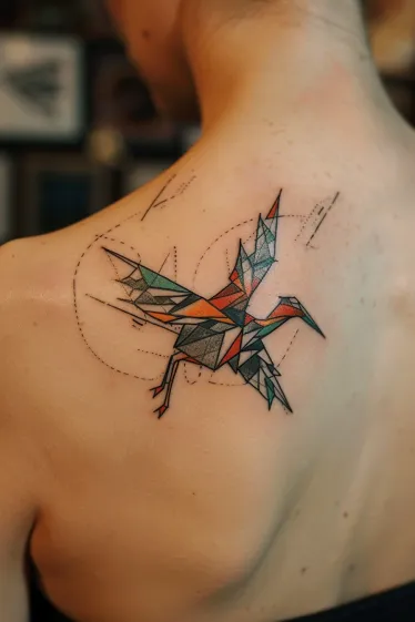 This stunning shoulder tattoo features a crane in mid-flight, drawn in a vibrant geometric style using fine line technique. Sharp triangular shapes form the bird s wings and body, filled with bold pops of orange, teal, and muted green. The linework around the design mimics technical sketches, with circles and dashed lines that make it feel like an art piece pulled straight from a creative journal. Everything about it feels intentional and super modern.