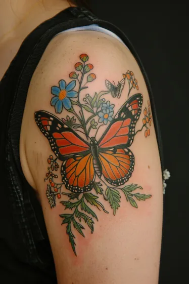 This gorgeous upper arm tattoo puts a vibrant monarch butterfly front and center, surrounded by a blooming bouquet of wildflowers in shades of blue, orange, and soft yellow. The fine line detailing keeps everything crisp and clean, while the bold coloring gives it that wow factor. The butterfly s wings are rich with warm orange and inky black edges, perfectly balanced by delicate stems, tiny buds, and little surprises like a second butterfly fluttering in the background. The whole piece flows so naturally around the shoulder and bicep, almost like it s growing right out of the skin.