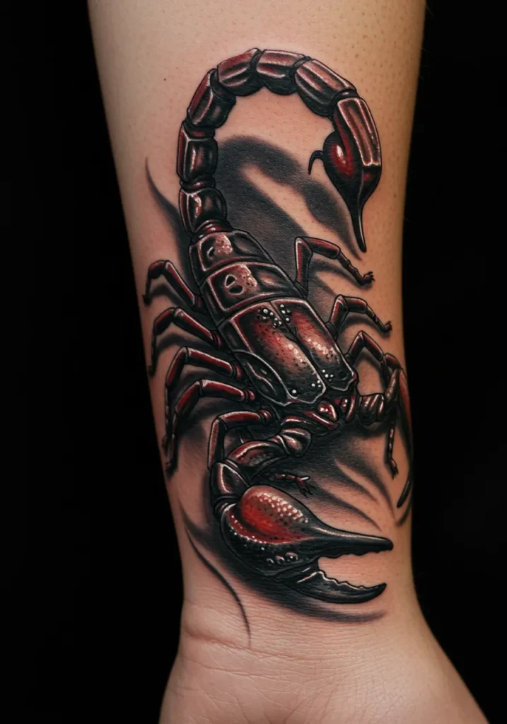 This tattoo features a striking black and red scorpion crawling up the wrist with intense detail. The inking captures every curve and joint of the creature s armor-like shell, with pops of glossy red that make it look almost metallic. The shadowing underneath gives it this ultra 3D effect, like it s actually perched on the skin. Its stinger curls menacingly toward the forearm, while the claws are bold and ready for action.