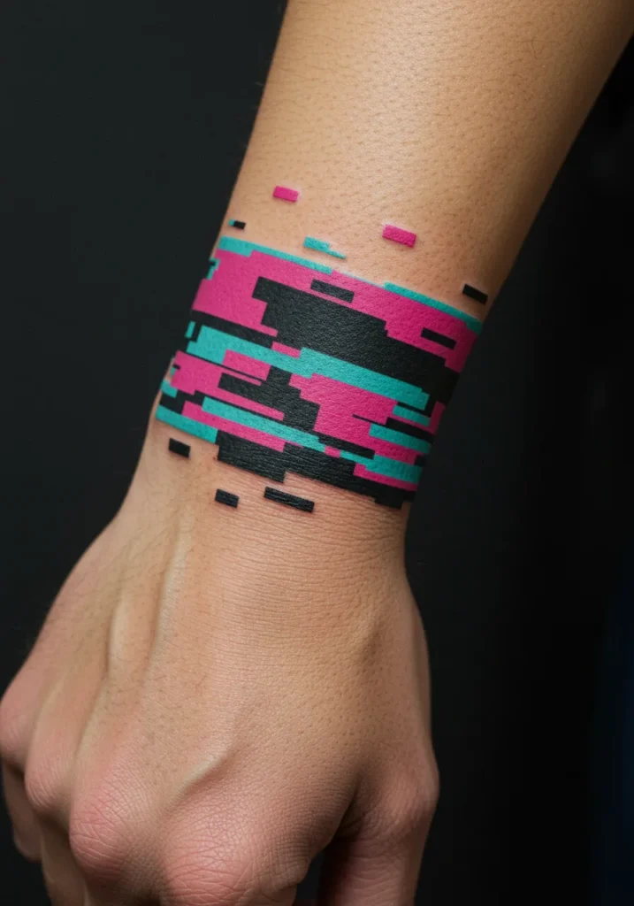This bold and creative wrist tattoo features a glitch-style design that feels straight out of a digital art gallery. Blocks of vivid fuchsia and teal ripple through thick black segments, creating a pixelated distortion effect that wraps cleanly around the wrist. The scattered pixels drifting above and below give it that signature broken-signal vibe, like a retro video game caught in a beautiful freeze-frame moment.