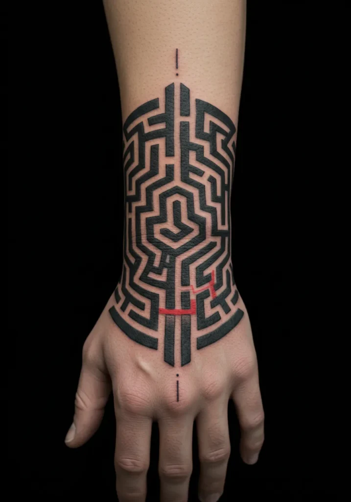 Maze Pattern Wrist Tattoo in Blackwork Style