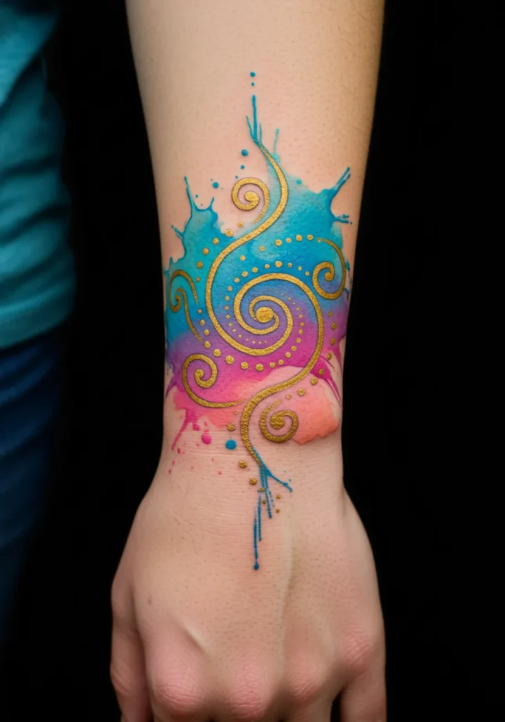 This wrist tattoo is a total burst of color and energy. The swirling golden spirals anchor the design with a whimsical flow, while the background explodes in dreamy watercolor shades of teal, pink, and purple. Splashes and drips create a sense of movement that feels like a cosmic dance happening right on your skin. The gold accents shimmer subtly and give it this rich, almost magical vibe without being flashy.