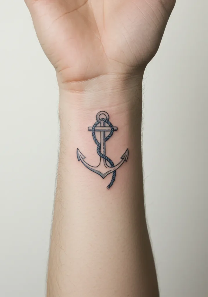 This clean and simple wrist tattoo features a finely detailed anchor wrapped with a soft blue rope. The lines are super crisp, with just a hint of shading that gives the anchor a little bit of depth without making it look too heavy. It s perfectly centered and sized just right for the wrist, creating a look that feels timeless and quietly confident.