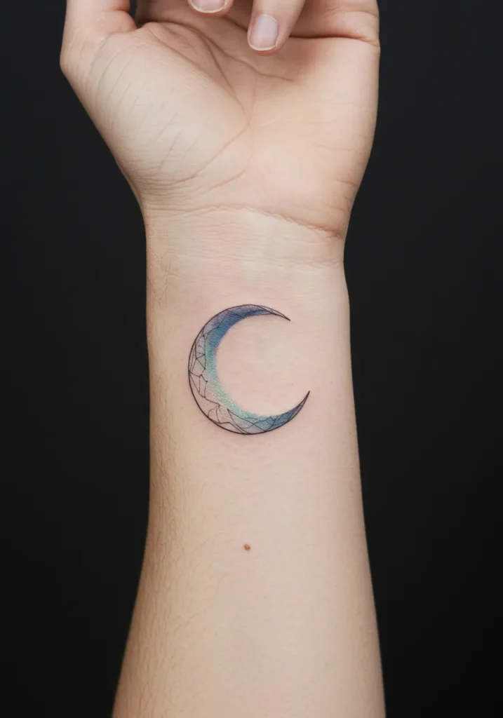 This wrist tattoo features a delicate crescent moon with soft, clean linework and a subtle geometric pattern etched inside. The moon glows with a dreamy watercolor blend of turquoise and lavender, creating an effect that feels both mystical and modern. It s not overly large or flashy, which makes it perfect for the wrist it sits there quietly, but it definitely makes a statement.
