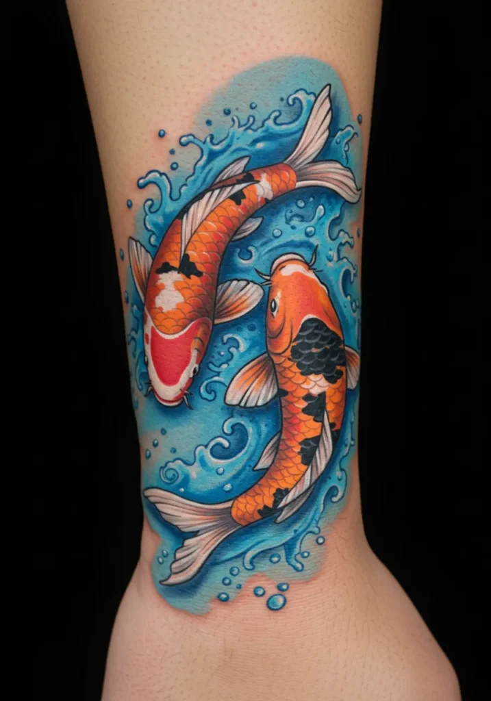 This stunning wrist tattoo brings two koi fish to life in vivid color, swimming in a swirl of bold blue water. The orange and black scales are packed with detail, and the subtle highlights on the fins give them a sense of movement, like they re really gliding beneath the surface. The curved composition wraps beautifully around the wrist, making it feel like the water and fish are constantly flowing together.