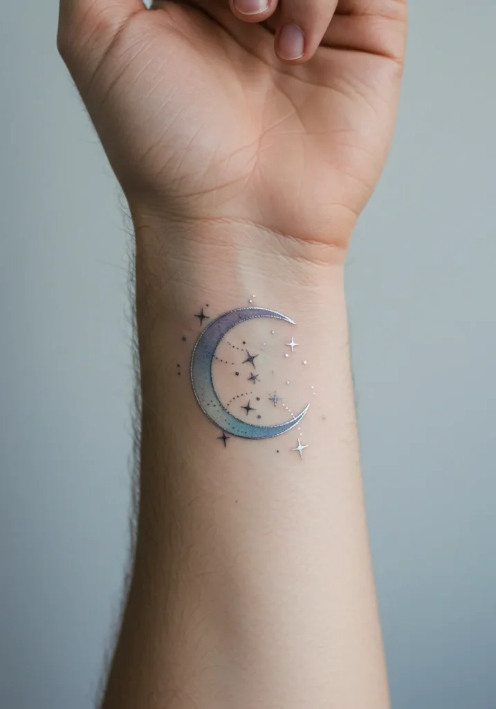 This dreamy wrist tattoo features a delicate crescent moon surrounded by a scattering of soft, glimmering stars. The moon is shaded with gentle gradients of blue, lavender, and grey, giving it an almost ethereal glow, while the stars range in size and sparkle to create a magical night sky effect. The placement feels personal and calming, like a little piece of the universe tucked right on the wrist.