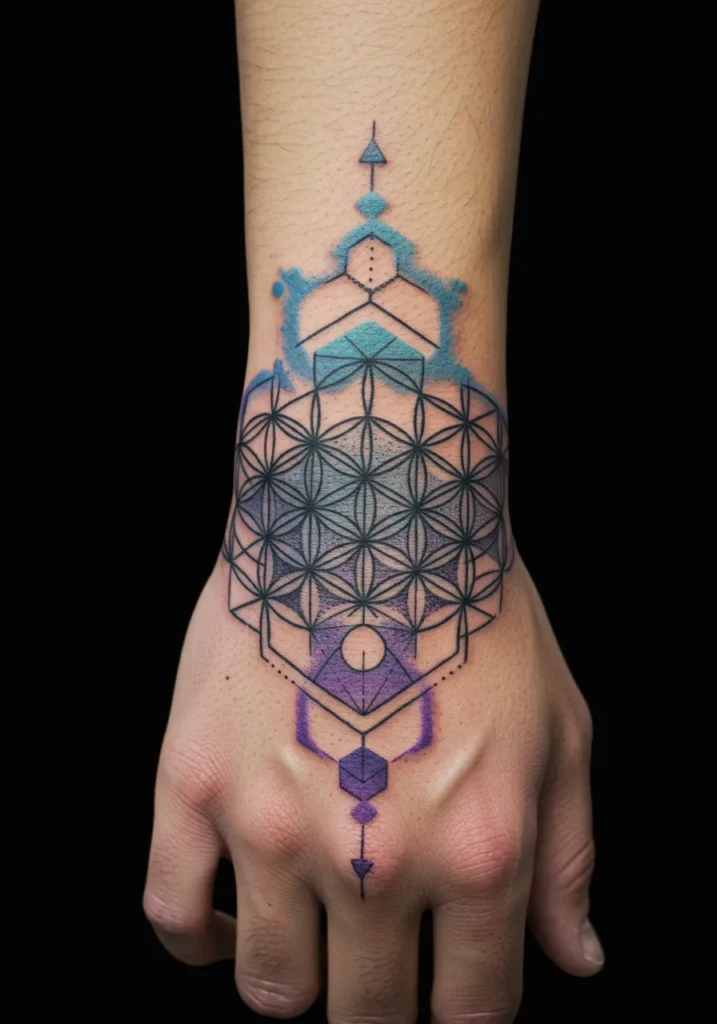 This tattoo blends fine-line sacred geometry with dreamy splashes of watercolor that flow beautifully from the wrist up to the hand. The main design features a Flower of Life pattern drawn with razor-sharp precision, surrounded by angular shapes and arrow-like points. Soft blue and purple watercolor washes peek through the geometric lines, giving it a sort of cosmic glow. It s the kind of tattoo that s all about symmetry, energy, and style.