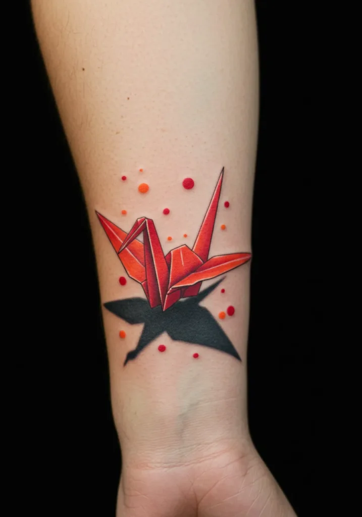 This colorful wrist tattoo features a bright red origami crane perched on top of a bold black shadow, with scattered red and orange dots floating around it like confetti. The crane itself is super crisp, shaded with vibrant reds and oranges that give it a shiny, almost paper-like texture. The bold shadow underneath adds contrast and makes the whole piece pop right off the skin, while the dots give it a playful, celebratory feel.