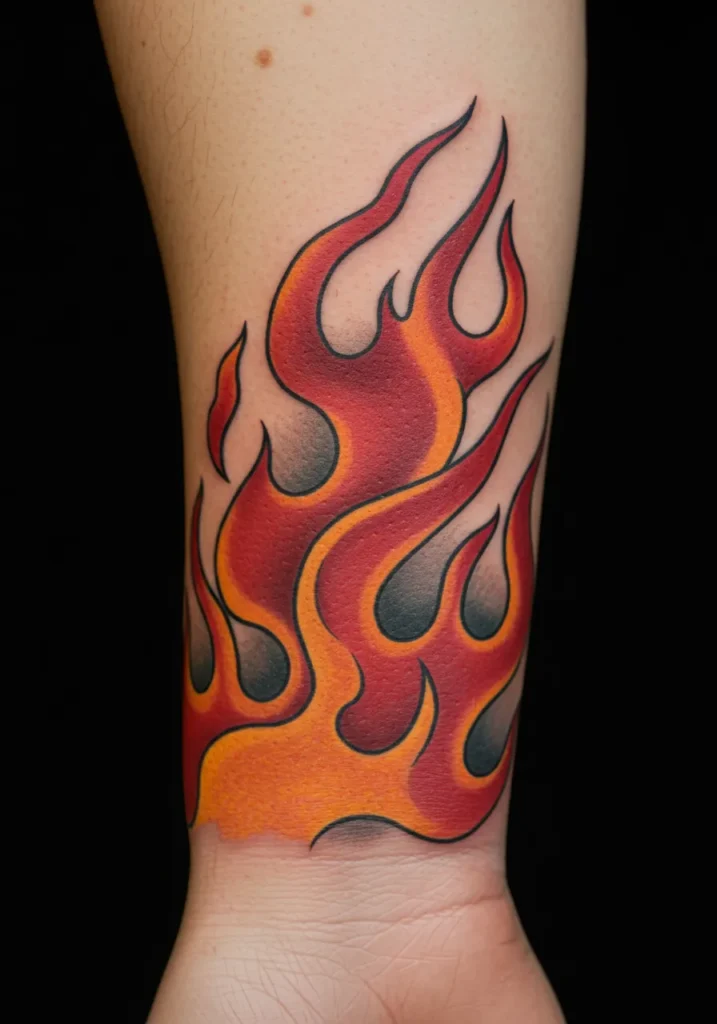 This wrist tattoo is pure fire. Literally. It features bold, stylized flames rising from the base of the wrist, done in a rich blend of fiery oranges, yellows, and reds. The inner shadows of the flames have a smoky, gradient black that adds serious depth, while the thick black outlines keep everything crisp and clean. The shape is elongated to wrap perfectly around the wrist and forearm, giving it that seamless flow that s hard to ignore.